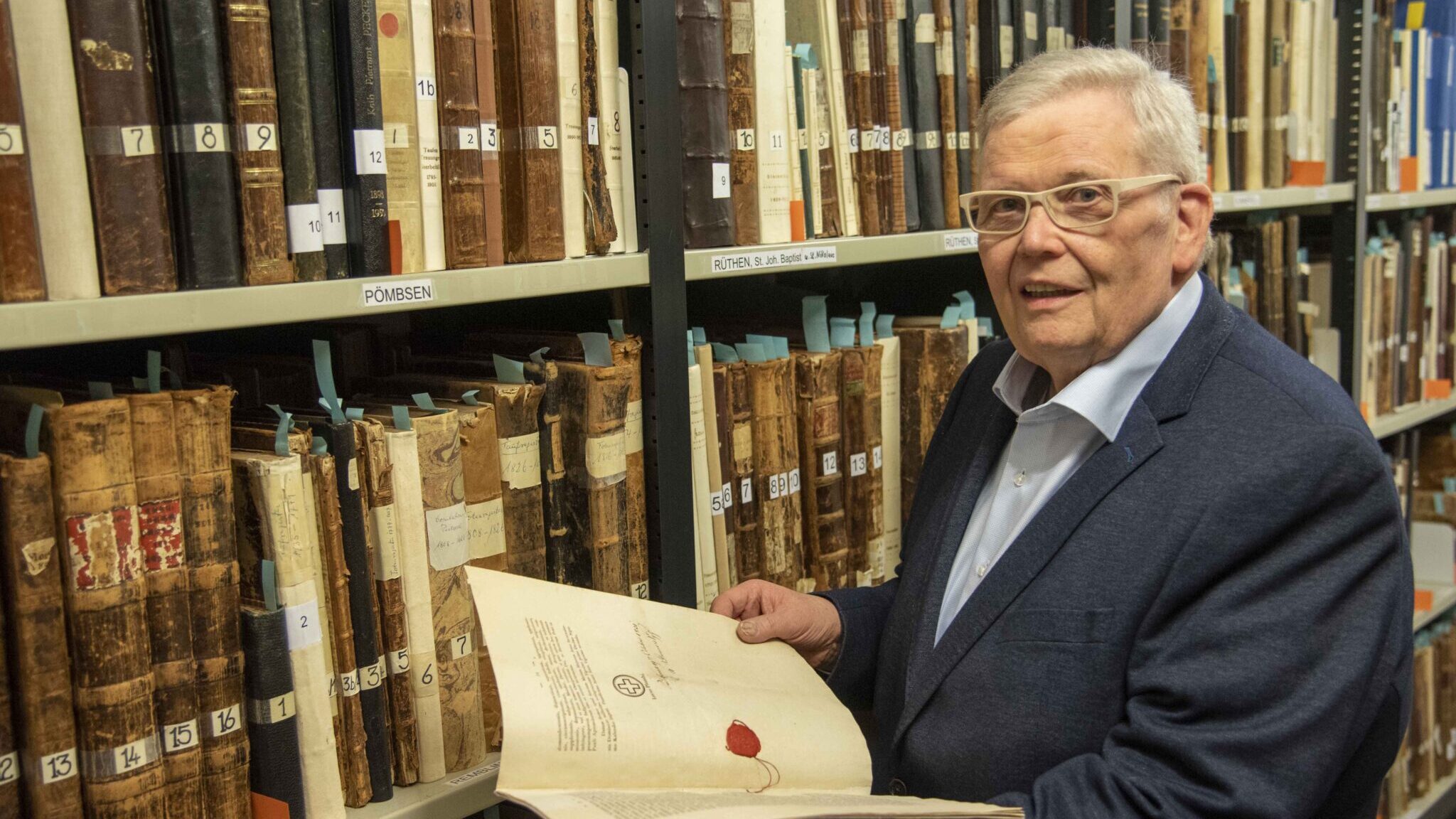 Erzbischof Dr. Udo Markus Bentz (l.) freut sich über die ersten drei Bände der Weiheregister, die ihm Autor Ulrich Schulz überreichte. Foto: ThF-PB