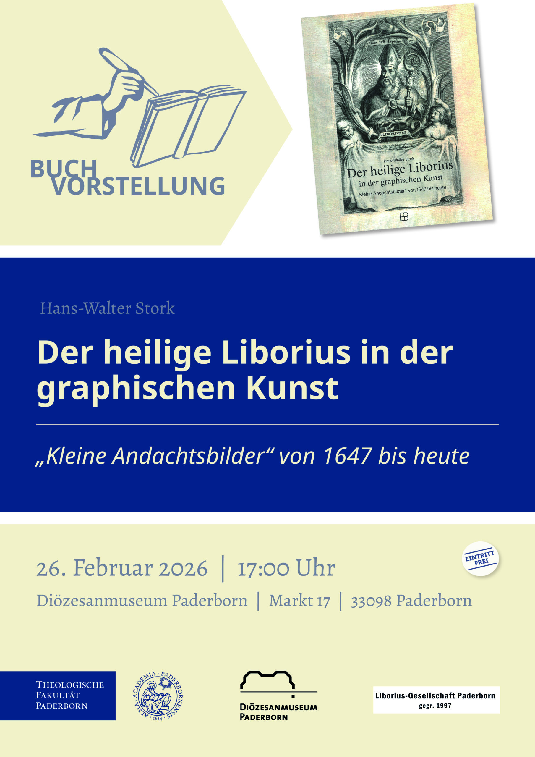 Anlässlich der Buchvorstellung werden dort originale graphische Blätter des 17. bis 21. Jahrhunderts aus den Sammlungen der Erzbischöflichen Akademischen Bibliothek und des Diözesanmuseums Paderborn gezeigt. Die Veranstaltung findet in Zusammenarbeit mit dem Diözesanmuseum Paderborn und der Liborius-Gesellschaft Paderborn e.V. statt. Die interessierte Öffentlichkeit ist herzlich willkommen. Der Eintritt ist frei.